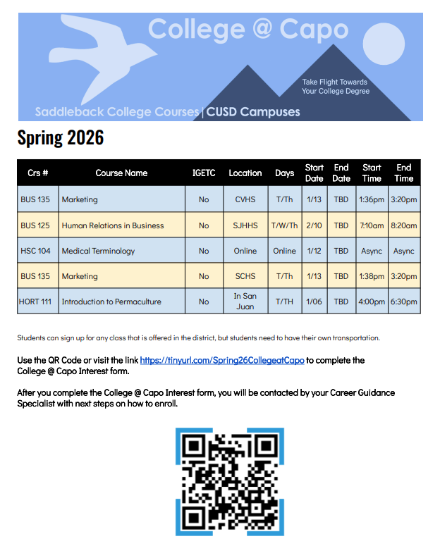 Please click the tab below to review the College @ Capo courses for the Spring 2026 semester and complete the interest form to get more information on how to register.
